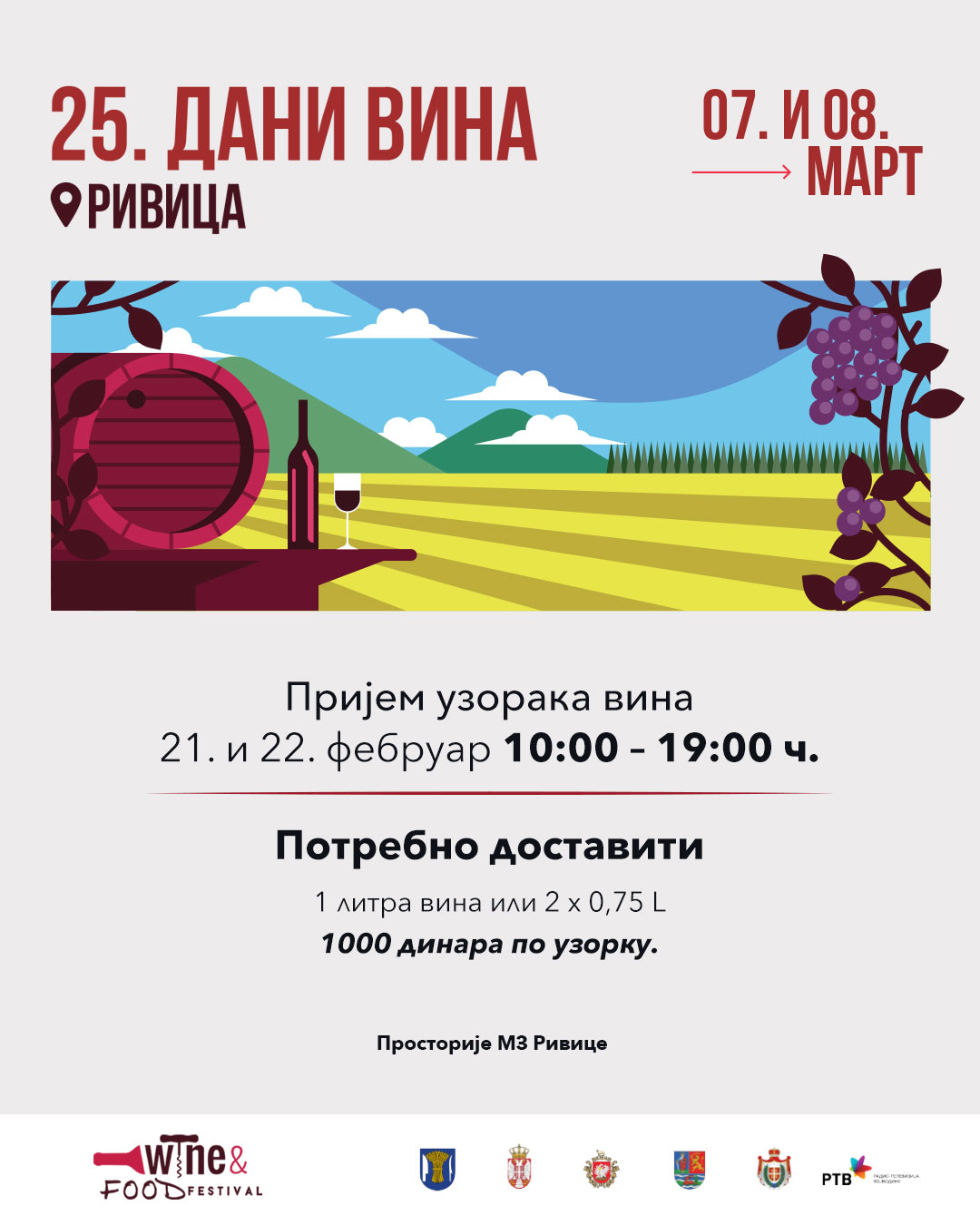 Пријем узорака ће се вршити у суботу и недељу, 21. и 22. фебруара 2026. године у просторијама МЗ Ривица од 10 до 19 часова. Потребно је доставити 1л вина или 2 х 0,75л у пластичној амбалажи и платити приликом предаје 1000 динара по узорку. Број узорака који можете предати на оцењивање није ограничен.